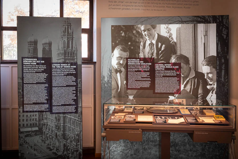Zwei Schreibtische, vier Vitrinen und ein „Setzkasten“ voller tragischer Geschichten: Sie umfassen fünfzig Jahre Literaturgeschichte von 1894 bis zum Ende des Zweiten Weltkriegs. Es ist eine Zeit, die durch starke gesellschaftliche, politische und wirtschaftliche Umbrüche geprägt ist: die Schwabinger Bohème, der Erste Weltkrieg, die Weimarer Republik, der Zweite Weltkrieg. Die Ausstellung „Literarisches München zur Zeit von Thomas Mann. Von der Bohème zum Exil“ gewährt – durch unterschiedliche Objekte, Fotos sowie Ton- und Filmaufnahmen, die zum großen Teil aus den Beständen des Archivs stammen – Einblicke in Lebenswirklichkeiten wichtiger Schriftstellerinnen und Schriftsteller dieser Zeit, darunter Oskar Maria Graf, Ödön von Horváth, Karl Valentin und Liesl Karlstadt, Franziska zu Reventlow, Annette Kolb sowie Frank Wedekind. Natürlich spielt die Familie Mann, allen voran Thomas Mann, aber auch Erika und Klaus Mann, eine wichtige Rolle in der Ausstellung. Wichtige Stationen sind der Literaturnobelpreis, das Kabarett Die Pfeffermühle sowie die Arbeit im Exil. Kuratiert wurde die Ausstellung von Dr. Elisabeth Tworek, die bis 2018 die Leitung der Monacensia innehatte.