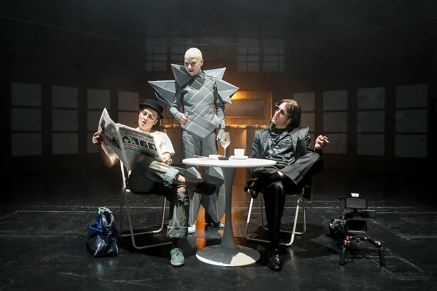 Das Stück „Munich Machine“ beginnt mit kosmischer Musik und Kirchenläuten, was eigentlich schon den Inhalt des Stücks auf den Punkt bringt. Es geht um Gesellschaft, Religion und um Utopie. Den Rahmen bildet der Filmemacher Klaus Lemke. Er begleitet die Zuschauer*innen auf ihrer Zeitreise durch die Münchner Geschichte seit dem ersten Weltkrieg.